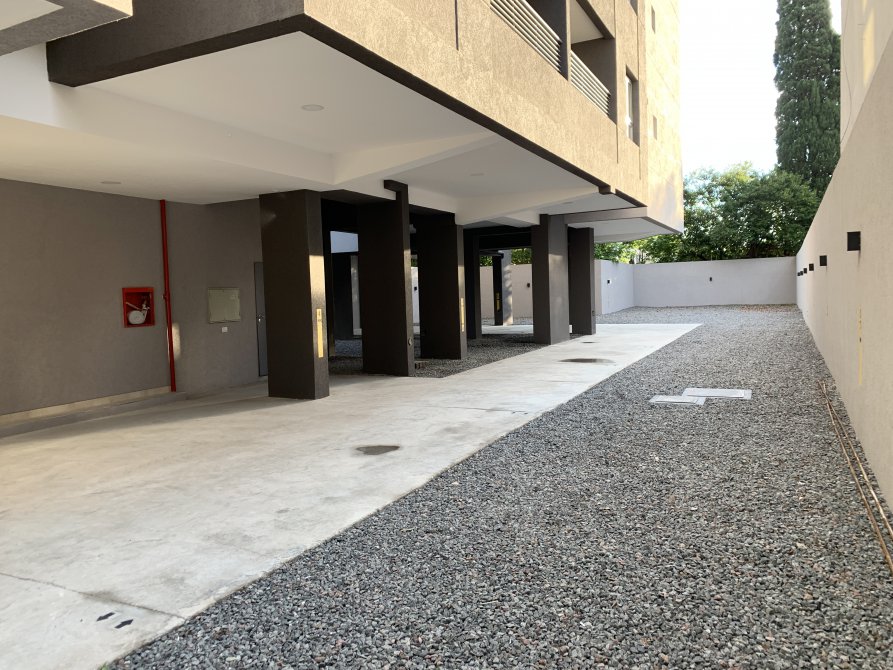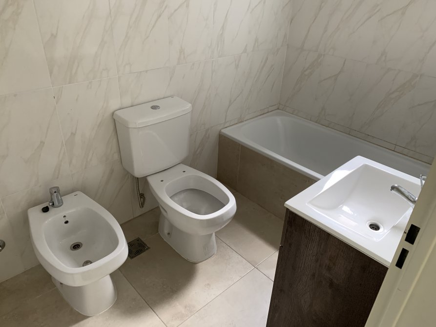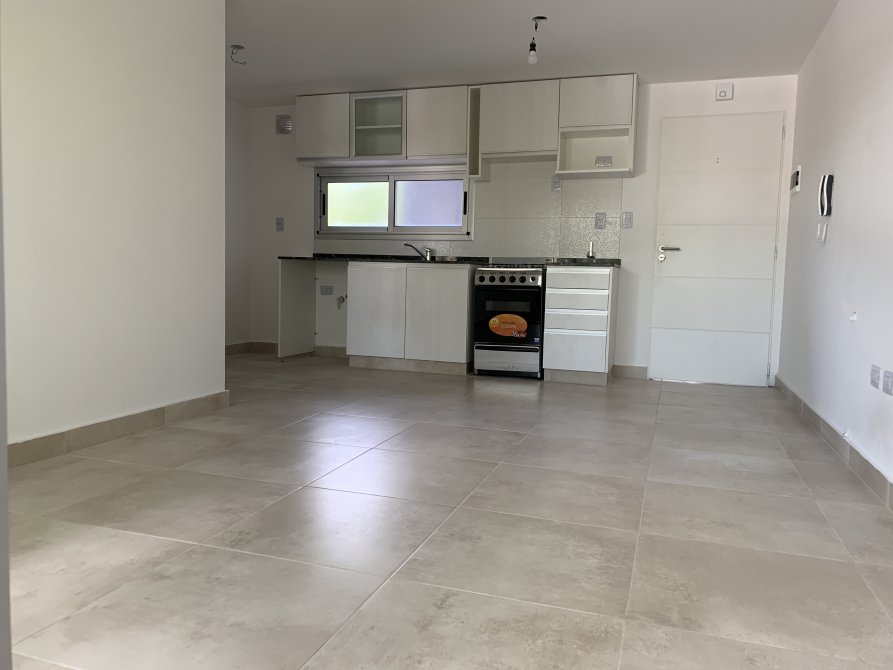 - Living-comedor-cocina con pisos de porcelanato italiano, mesadas, muebles bajo mesada y alacena.